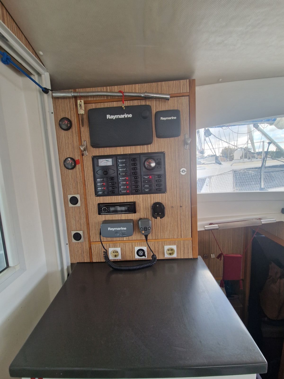 Meuble haut avec façade noire comprenant:tableau électrique complet,emplacement pour électronique de navigation, 2 jauges à gas oil indépendantes,1 jauge à eau douce,liseuse, interrupteur, prises12v/220v,1 controleur de tension, divers interrupteurs, rangement au dessus du meuble + meuble bas….