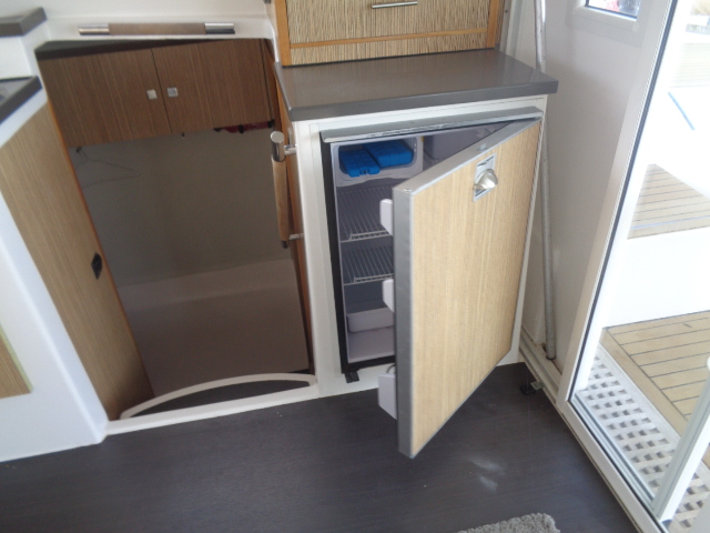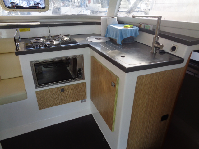 Capacité eau 400l (3 réservoirs), chauffe eau électrique 25l sur échangeur moteur et 220V. 2 Pompes de cale électriques et automatique  par coque + 2 pompes de cales manuelles avec commande au cockpit (1 par coque).