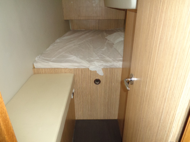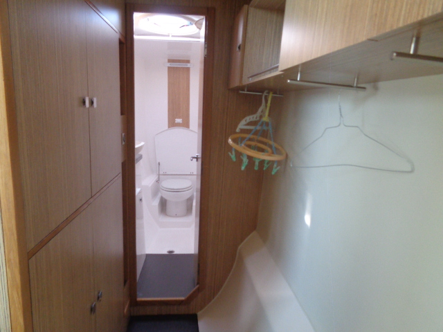 Cabine arrière tribord :140x 200cm- grande penderie et équipets de rangements avec façades et portes ZEBRANO, boutons poussoirs et charnières inox.Couchage double sur matelas mousse avec enveloppe “coutil”