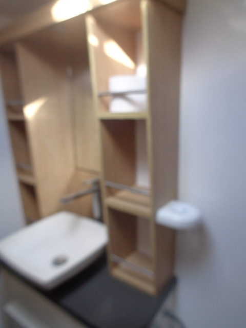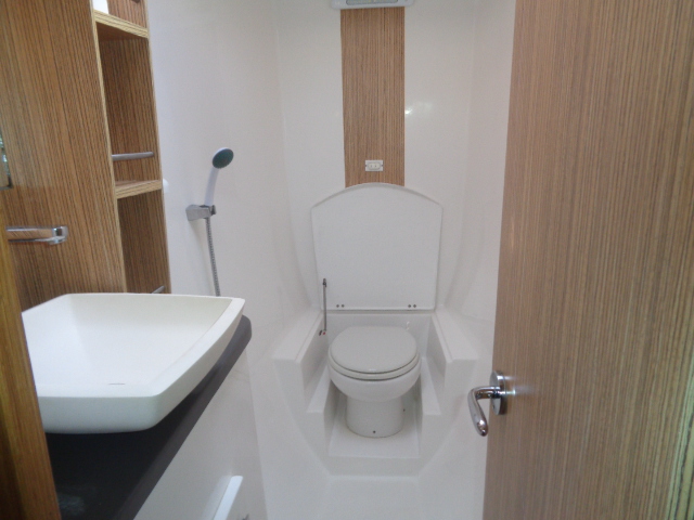 Salle d’eau et WC sur avant  tribord :1 lavabo semi sphérique avec bonde en laiton chromé, robinet mitigeur inox, eau douce chaude/froide sous pression, meubles haut pour rangement,miroir, porte savon,porte serviette, main courante inox, prise 12v.