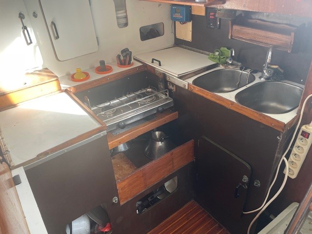 Les aménagements intérieur sont parfaitement fonctionnels: on découvre une grande cuisine en L sur tribord, Table à cartes et couchette du navigateur.