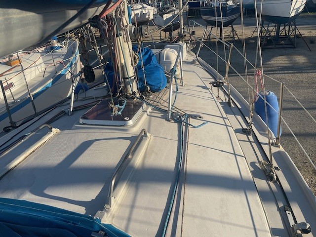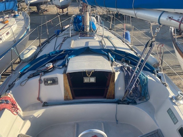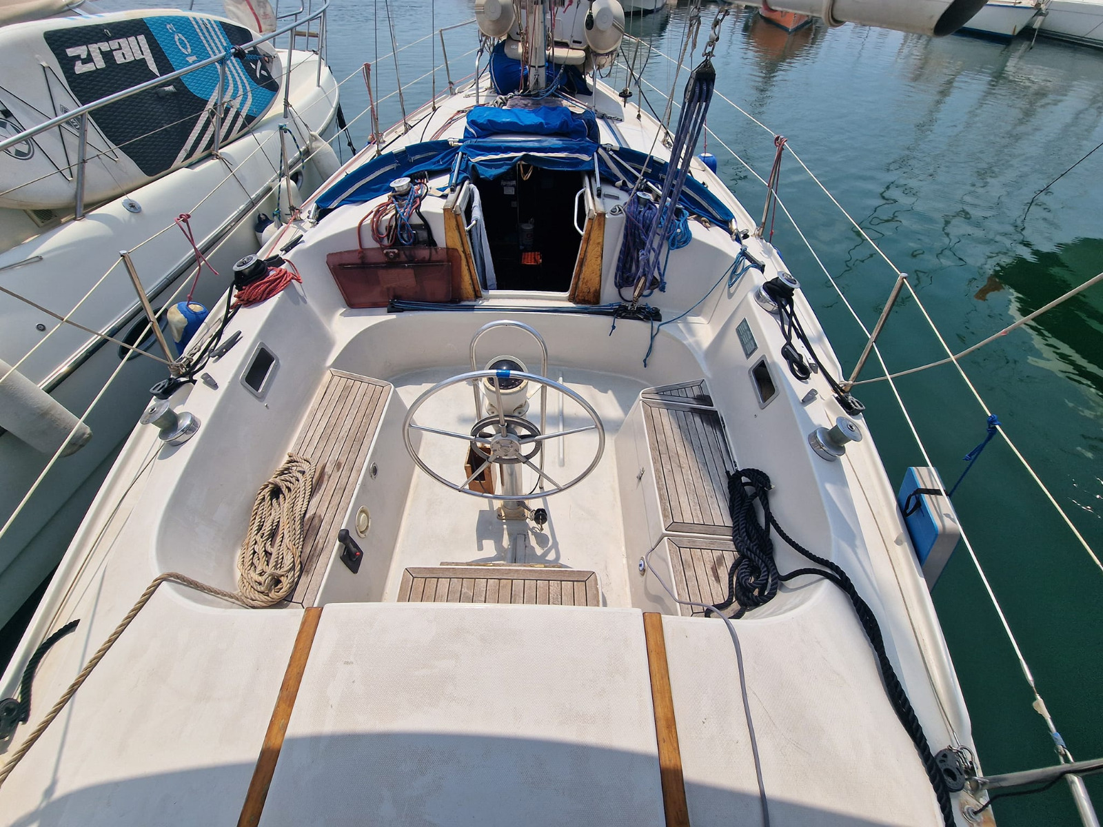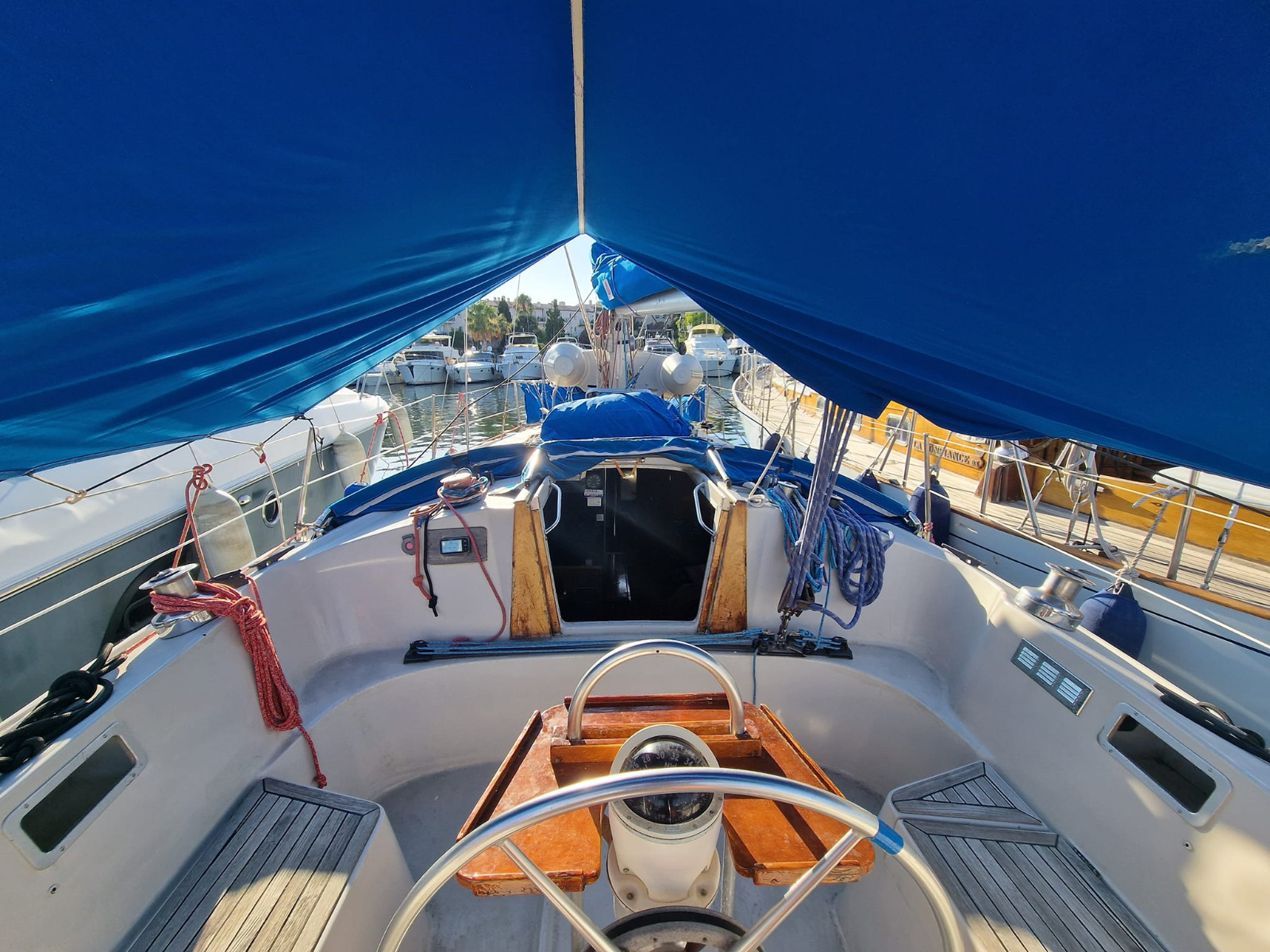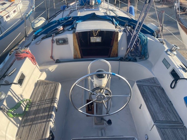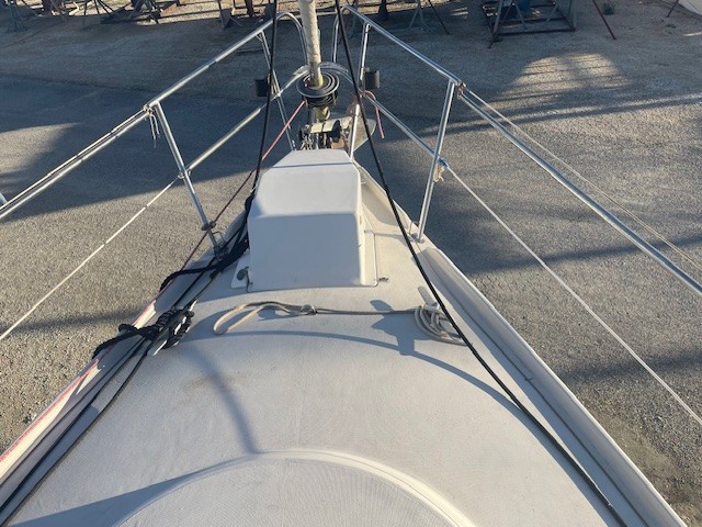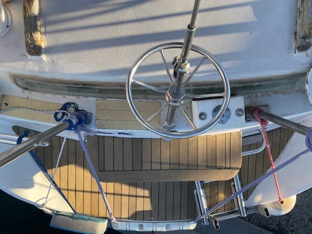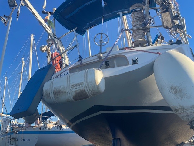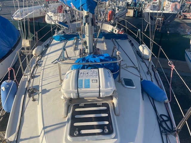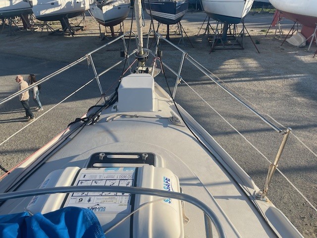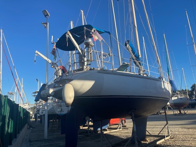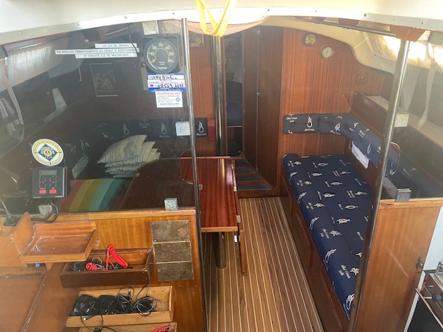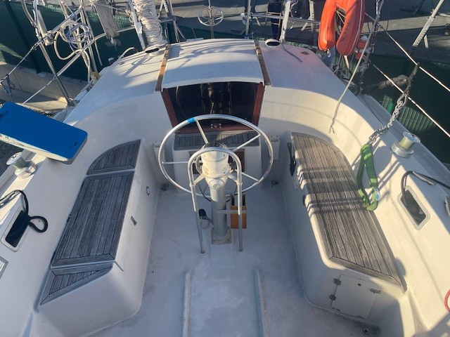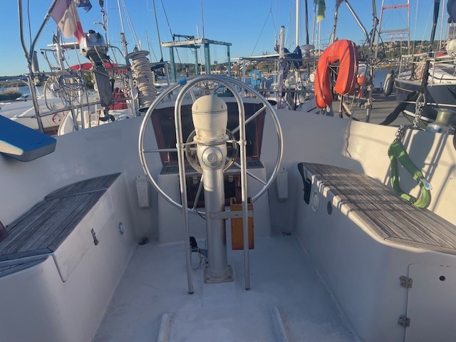 Réfection d’une jupe arrière 09/2023 avec revêtement teck + échelle télescopique + main courante + marche pied en teck, passerelle, bossoirs, table de cockpit, guindeau électrique + mouillage principal, douchette de cockpit, pompe de cale Manuelle + électrique, cockpit teck.