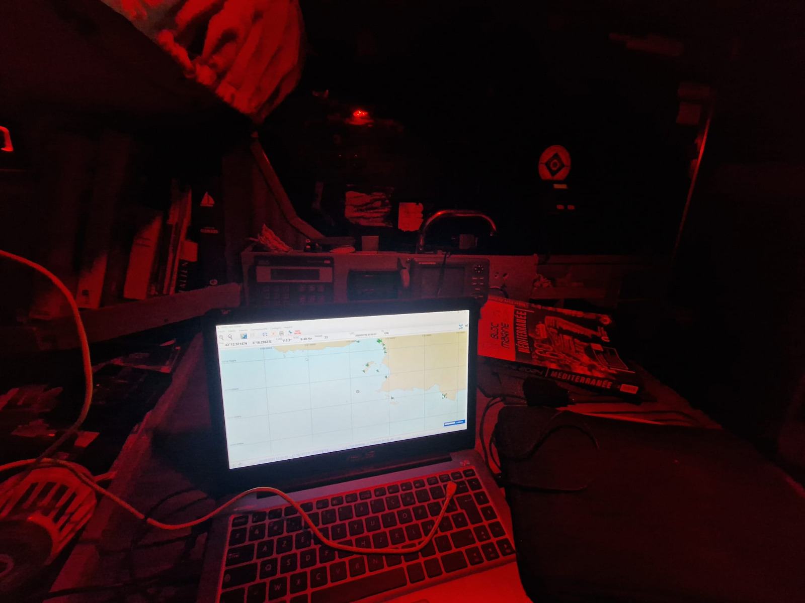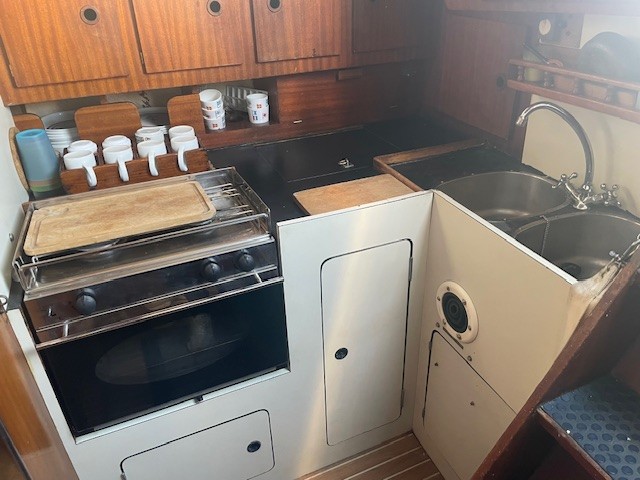 A l’intérieur, les aménagements sont parfaitement fonctionnels: on découvre une grande cuisine en L sur tribord et la table à cartes accolé à la couchette du navigateur sur l’autre bord.