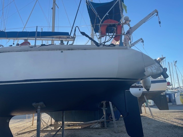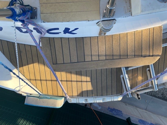 Le chantier Gibert Marine avait pris de la marge quant à l’échantillonnage du gréement et de l’accastillage. Réfection d’une jupe arrière avec revêtement teck et marche pied qui améliore ses performances et le confort à l’eau.