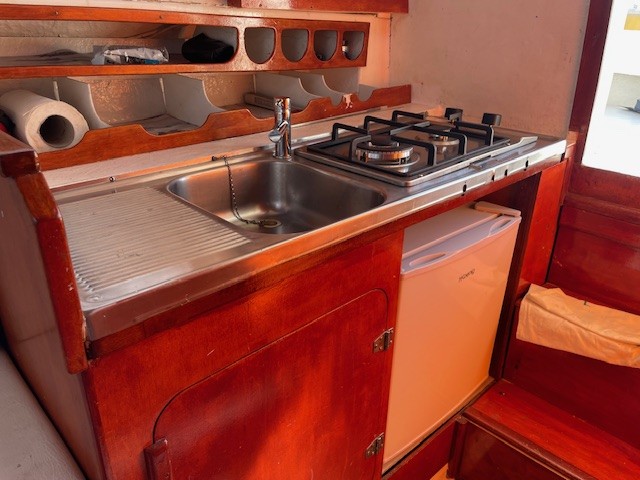 Coin cuisine comprenant un évier inox, plaque chauffante inox, Frigo 220
